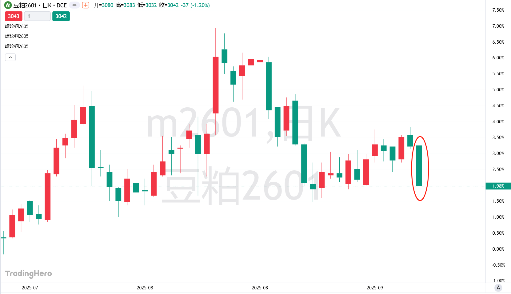 9月15日周一,豆粕期货价格整体承压下行,日内收跌1.46%,报3042元/吨。综合市场分析认为,美国农业部(USDA)于9月发布的月度供需报告数据整体偏空,成为压制日内豆粕价格表现的主要因素。尽管美豆单产小幅下调,但种植面积与总供应量上调,叠加出口需求走弱及期末库存上升,共同加剧了市场的看空情绪。
